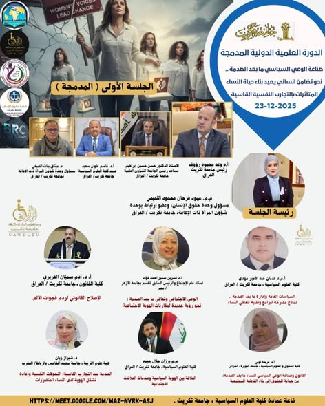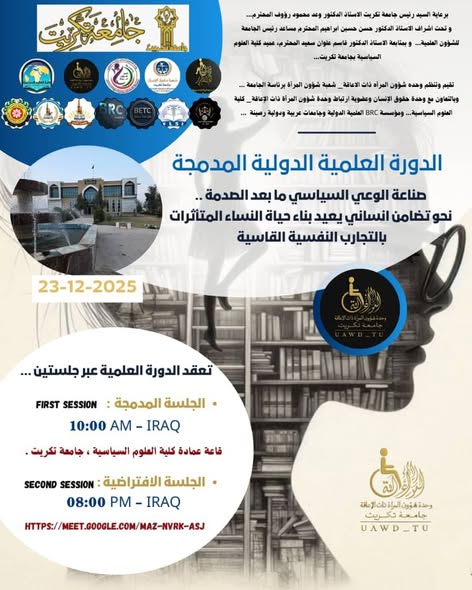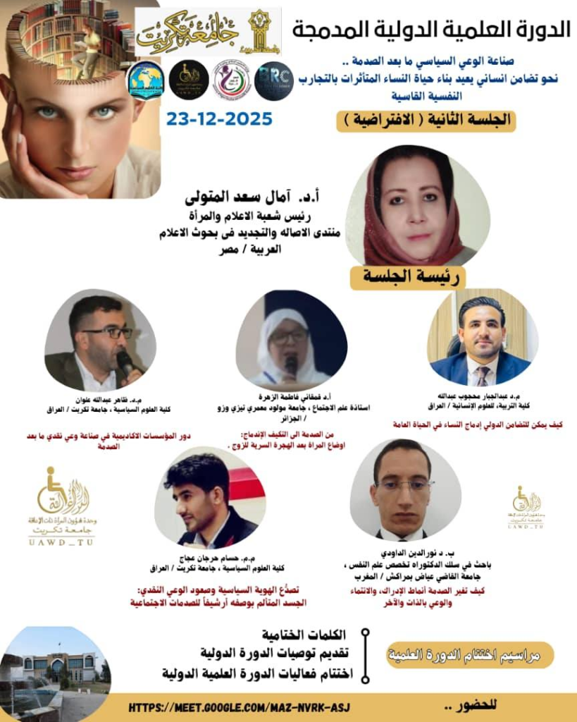 الدورة العلمية الدولية المدمجة :”صناعة الوعي السياسي ما بعد الصدمة: نحو تضامن إنساني يعيد بناء حياة النساء المتأثرات بالتجارب النفسية القاسية”…