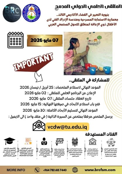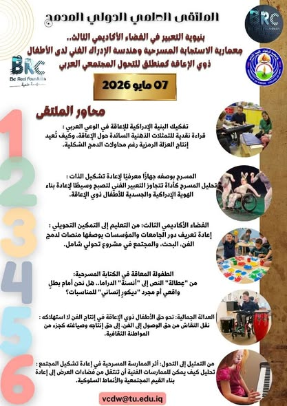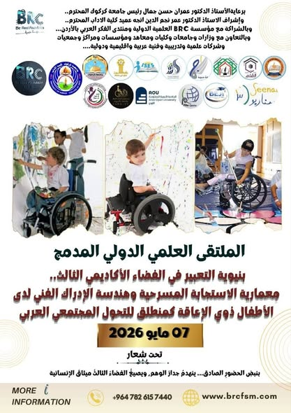 في أفقٍ يتقاطع فيه الوعي الجمالي مع المسؤولية الإنسانية، وتلتقي فيه المعرفة بالفعل التحويلي، تُعلن مؤسسة BRC العلمية الدولية، وبالشراكة مع نخبة رصينة من الوزارات والجامعات والمؤسسات والمراكز والجمعيات والشركات الأكاديمية العربية والإقليمية والدولية، عن فتح باب المشاركة بأوراق علمية في الملتقى العلمي الدولي المدمج : “بنيوية التعبير في الفضاء الأكاديمي الثالث: معمارية الاستجابة المسرحية وهندسة الإدراك الفني لدى الأطفال ذوي الإعاقة كمنطلق للتحول المجتمعي العربي”…