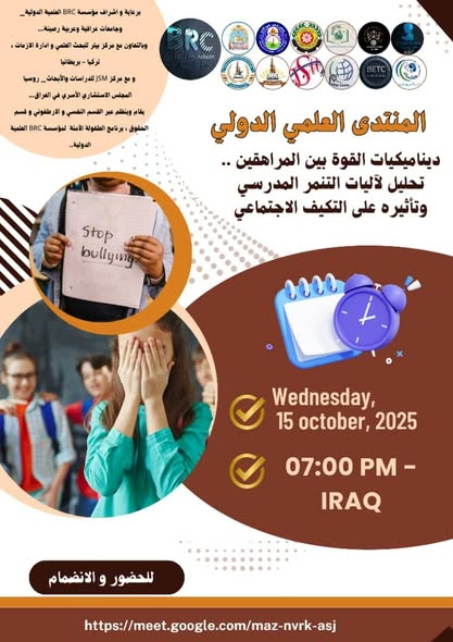 #تحت إشراف مؤسسة BRC العلمية الدولية… وبشراكات نوعية مع جامعات عراقية وعربية مرموقة، وبالتعاون مع مؤسسات دولية مرموقة… ينطلق هذا المنتدى المتكامل.. عبر تعاضد القسم النفسي والارطوفوني وقسم الحقوق، ليس كفعالية، بل كموقف… فحين تصرخ الأرصفة بصوت الطفولة المنكوبة… وحين يتسلّل العنف عبر زوايا المدرسة والبيت.. يصبح الصمت جريمة…