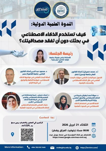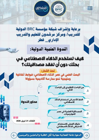 #وبرعاية الشبكة التدريبية لمؤسسة BRC International/ مركز مرشدون للتعليم والتدريب الإداري في قطر… ندعوكم لحضور الندوة العلمية الدولية الموسومة: “كيف تستخدم الذكاء الاصطناعي في بحثك دون أن تفقد مصداقيتك؟”…. والتي تقام تحت شعار: “البحث العلمي في عصر الذكاء الاصطناعي.. ضوابط أخلاقية ومنهجية نحو ممارسة أكاديمية مسؤولة”…