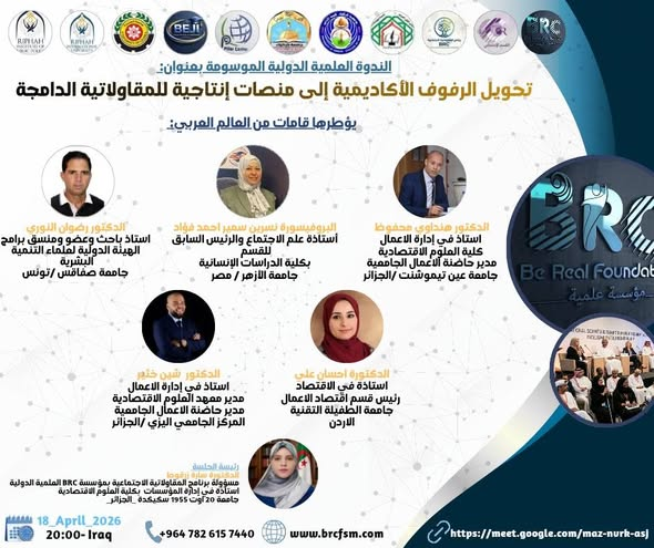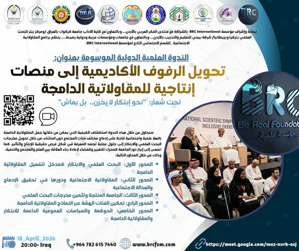 #برعاية وإشراف مؤسسة BRC International بالشراكة مع منتدى الفكر العربي بالأردن… وبالتعاون مع كلية الآداب جامعة كركوك بالعراق / ومركز بيلر للبحث العلمي بتركيا وبريطانيا/ شركة بيجي للتعليم والتدريب بالأردن… وبالتعاون مع جامعات ومؤسسات عربية ودولية رصينة…. ينظم برنامج المقاولاتية الاجتماعية_ قسم الاجتماع التابع لمؤسسة BRC International.. الندوة العلمية الدولية : “تحويل الرفوف الأكاديمية إلى منصات إنتاجية للمقاولاتية الدامجة”.. 18 أبريل / نيسان 2026… وتحت شعار: “نحو ابتكار لا يُخزَّن… بل يُعاش”….