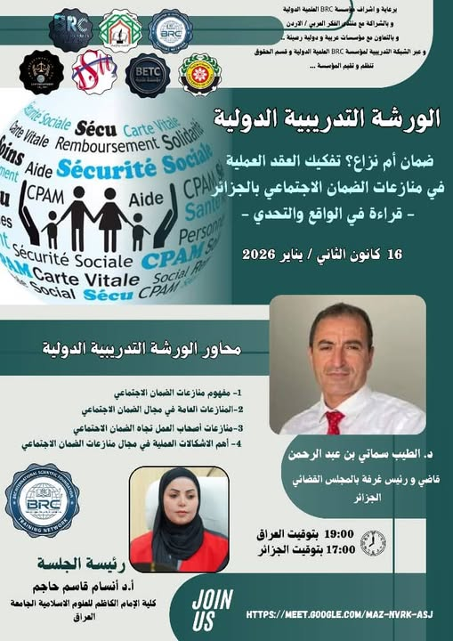 تتشرف الشبكة التدريبية لمؤسسة BRC العلمية الدولية وشركائها الدوليين.. بدعوتكم إلى حضور ومواكبة الورشة التدريبية الدولية “ضمان أم نزاع؟ تفكيك العقد العملية في منازعات الضمان الاجتماعي بالجزائر_ قراءة في الواقع والتحدي…