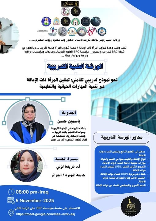 الورشة العلمية التدريبية : “نحو نموذج تدريبي تكاملي: تمكين المرأة ذات الإعاقة عبر تنمية المهارات الحياتية والتعليمية”…