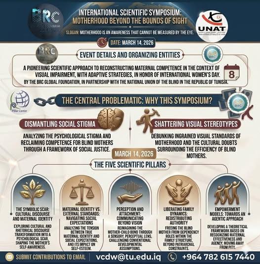 هذا الإعلان ليس مجرد دعوة لندوة علمية، بل هو دعوة لثورة فكرية تعيد تعريف “الأمومة” بعيداً عن حاسة البصر… فهل تُبصر القلوب ما تعجز عنه العيون؟ الأمومة ليست “رؤية”، بل هي “وعي”.. هي بصيرة تتجاوز حدود المشهد البصري لتسكن في عمق الإدراك النفسي والعاطفي… لذلك تتشرف مؤسسة BRC العلمية الدولية بالشراكة مع الاتحاد الوطني للمكفوفين بالجمهورية التونسية.. وبالتعاون مع مركز بيلر للبحث العلمي تركيا بريطانيا والمؤسسات الرصينة… وبمناسبة اليوم العالمي للمرأة.. بدعوتكم للمشاركة في الندوة العلمية الدولية: “الأمومة خارج مركزية البصر”.. وتحت شعار: “الأمومة وعي لا يُقاس بالعين”…