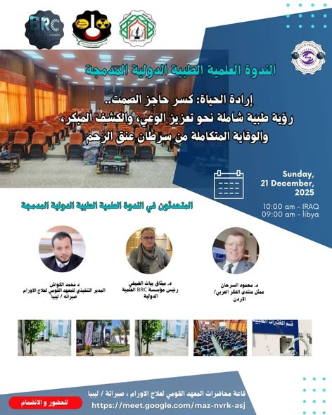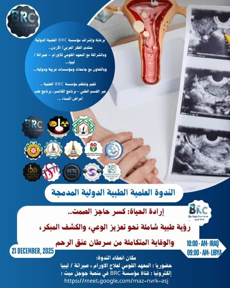 #في عالمٍ يُهدّد فيه الصمت صحة المرأة أكثر من المرض نفسه، تأتي الندوة الطبية الدولية المدمجة : “«إرادة الحياة… كسر حاجز الصمت» رؤية طبية شاملة لتعزيز الوعي والوقاية المتكاملة من سرطان عنق الرحم”… والتي تقام برعاية وإشراف مؤسسة BRC العلمية الدولية_ منتدى الفكر العربي_ الأردن… وبالشراكة مع المعهد القومي للأورام_ صبراتة / ليبيا… وبالتعاون مع جامعات ومؤسسات عربية ودولية… يعقدها القسم الطبي بمؤسسة BRC العلمية الدولية وعبر برنامج الكانسر وبرنامج طب أمراض النساء…