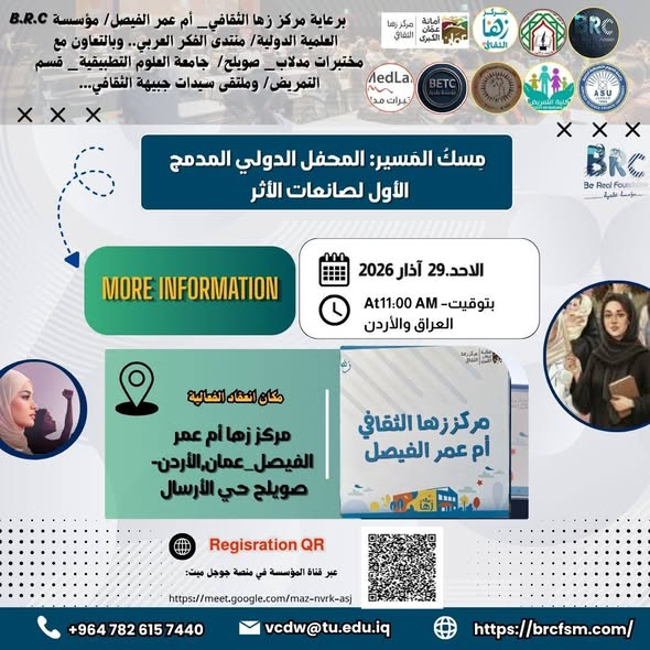 #تتشرف مؤسسة B.R.C العلمية الدولية/ مركز زها الثقافي_ أم عمر الفيصل/ منتدى الفكر العربي.. وبالتعاون مع مختبرات مدلاب_ صويلح/ جامعة العلوم التطبيقية_ قسم التمريض/ وملتقى سيدات جبيهة الثقافي…
