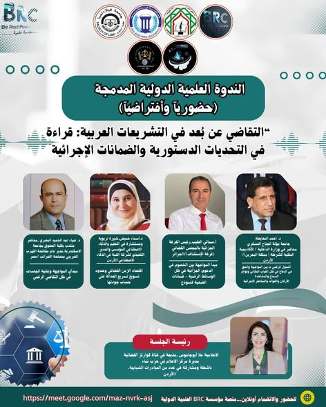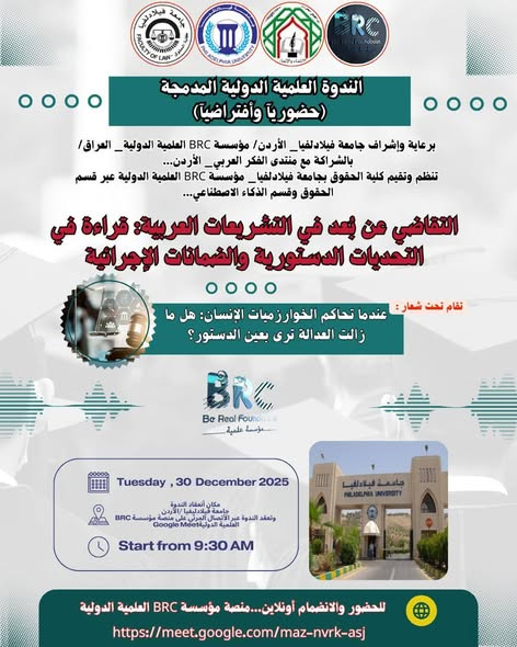#دعوتكم للحضور في الندوة العلمية الدولية المدمجة: “التقاضي عن بُعد في التشريعات العربية: قراءة في التحديات الدستورية والضمانات الإجرائية”… والتي تُقام تحت الشعار اللافت: “عندما تحاكم الخوارزميات الإنسان… هل ما زالت العدالة ترى بعين الدستور؟”…